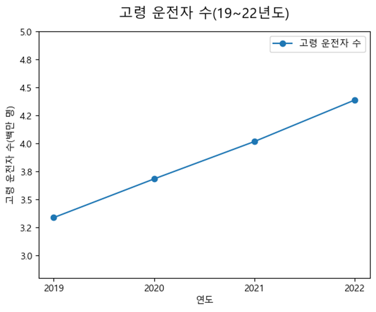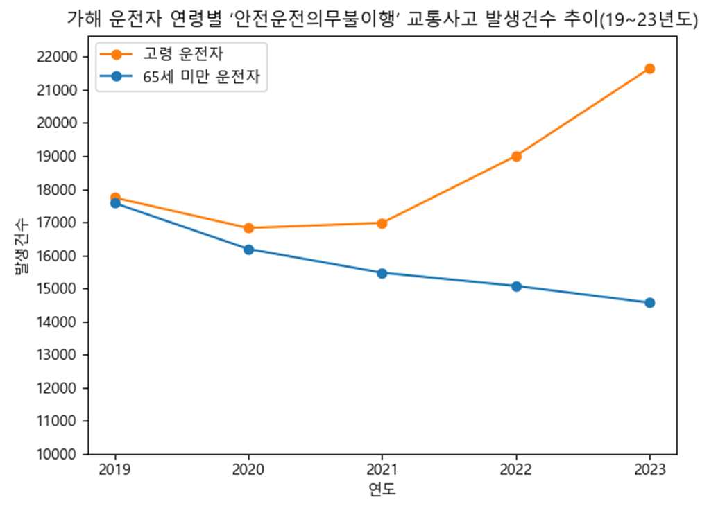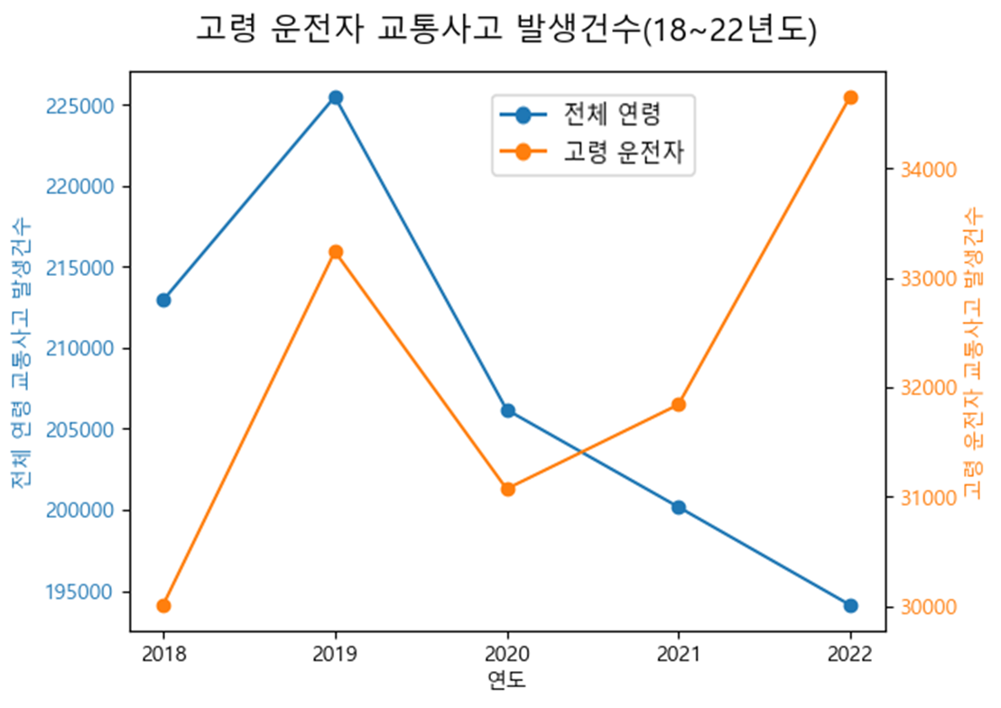 2018년도에서 2022년도까지 교통사고 발생률은 고령 운전자와 나머지 운전자들 간에 다른 추이를 보인다. 2018년 대비 2022년에, 65세 미만 운전자들은 8.84% 감소한 반면, 고령 운전자 교통사고 15.46% 증가했다.