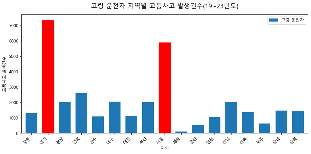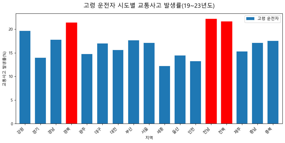 위 그림은 지역 내에서 발생한 교통사고 중 고령 운전자의 교통사고 비중을 나타낸 그래프이다. 이 그래프에서는 달랐다. 경북, 전남, 전북이 높은 고령 운전자 교통사고 비율을 가지고 있다.