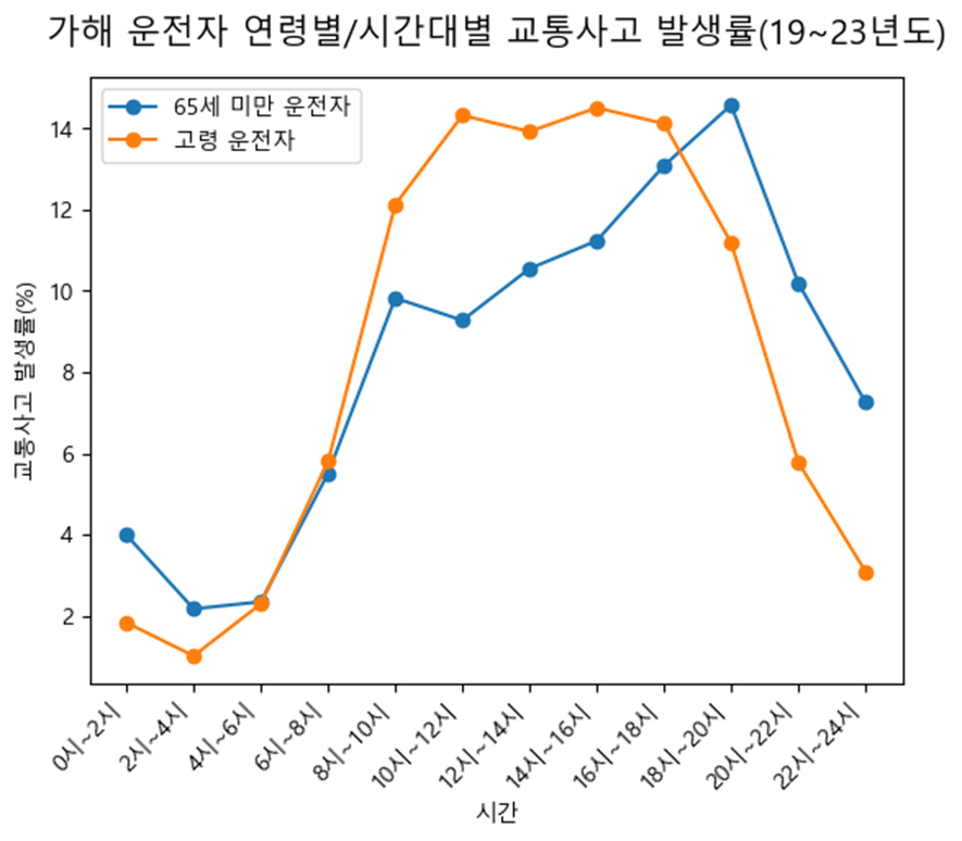해당 그래프는 2개 연령대별 그룹의 시간대별 교통사고 발생률을 나타낸 것이다. 최초에는 고령 운전자는 야간 등의 가시거리가 제한된(혹은 시야방해가 큰) 시간대에 교통사고를 많이 일으킬 것으로 예상했다.