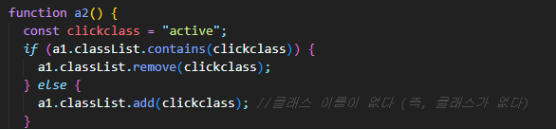 즉, toggle은 a1의 classList에 clickclass가 이미 있는지 확인해서