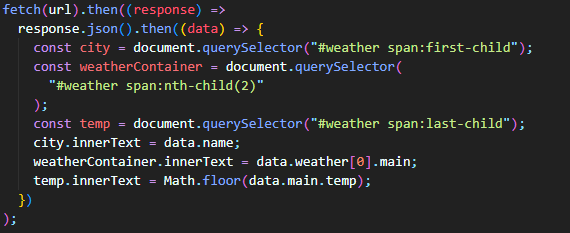 위와 같이 then을 사용하여 response을 받고 json으로 부터 얻은 데이터들을 각 태그 innerText에 적용하여주면서