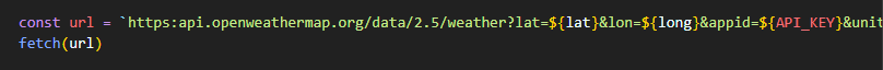 const url = https:api.openweathermap.org/data/2.5/weather?lat=${lat}&lon=${long}&appid=${API_KEY}&units=metric;