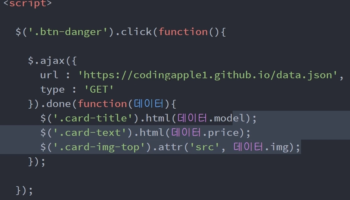 성공했을경우 done에 입력된 함수를 실행시킴 (파라미터안에는 위에서 가져온 데이터가 표시)