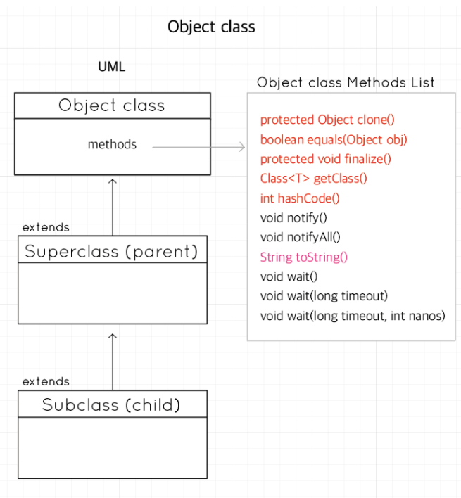 - 모든 클래스에서 Object 클래스에 구성된 메소드를 사용할 수 있다.