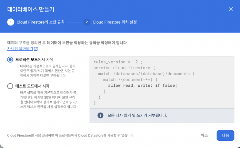 프로덕션 vs 테스트 모드 선택(보안규칙 차이 존재)