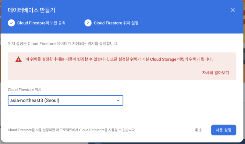 데이터 베이스 만들기 버튼 누르기(생성된 firebase 프로젝트 존재시)