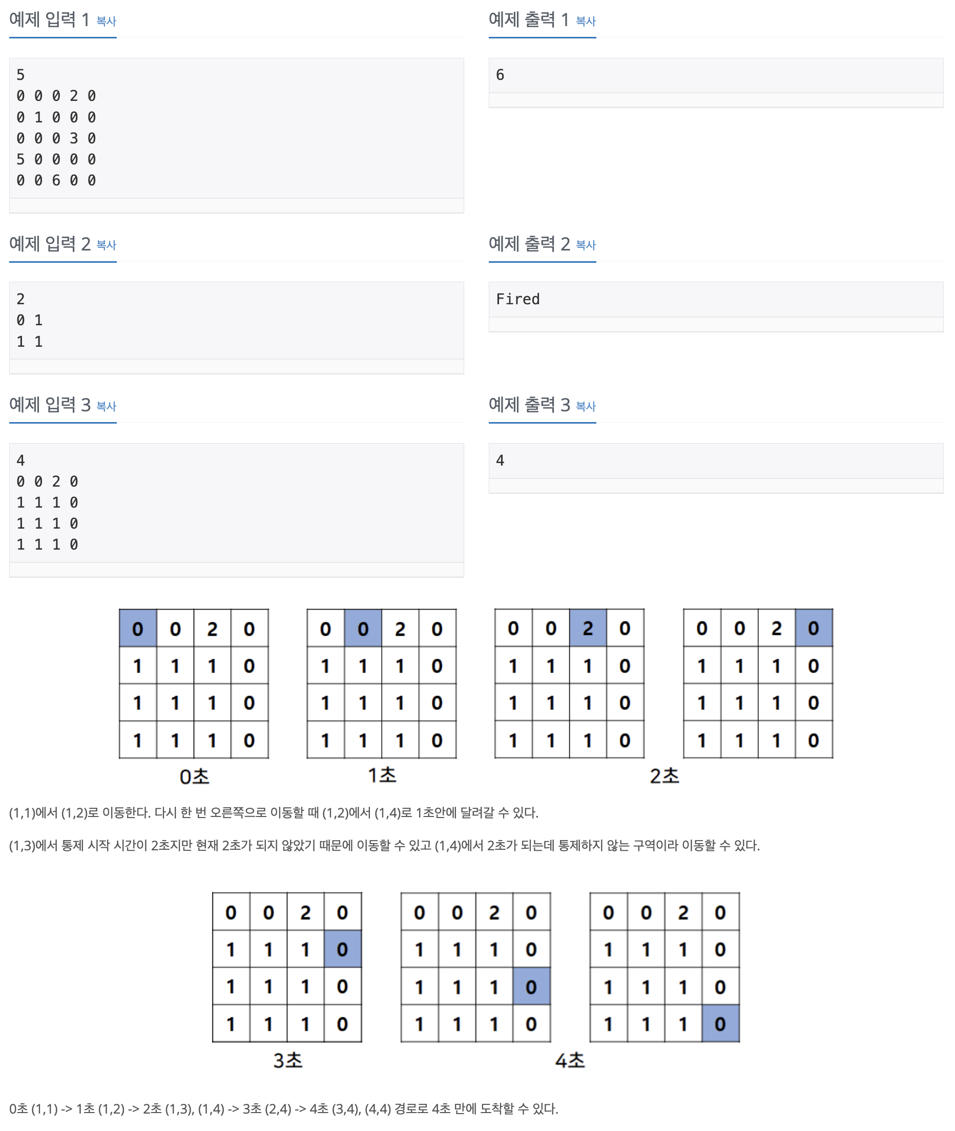 공사로 인해 통제하는 구역은 N x N 지도에 통제 시작시각이 초 단위로 주어지며 통제를 시작하기 전까지만 그 구역을 들어갈 수 있다. 통제 시작시각과 그 구역에 도착시각이 같은 시간일 경우에는 구역에 들어갈 수 없다.