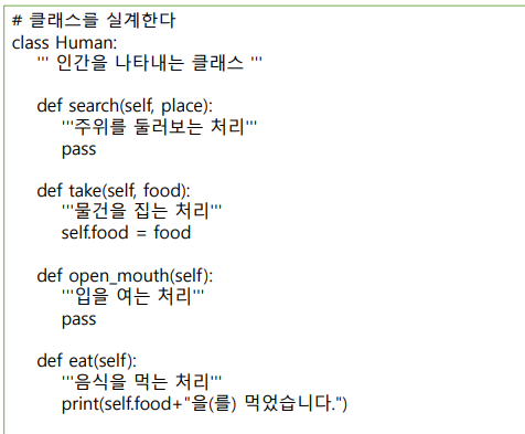 - 클래스 안에 있는 메서드를 정의 할때는 첫 번째 인수로 반드시 self를 지정