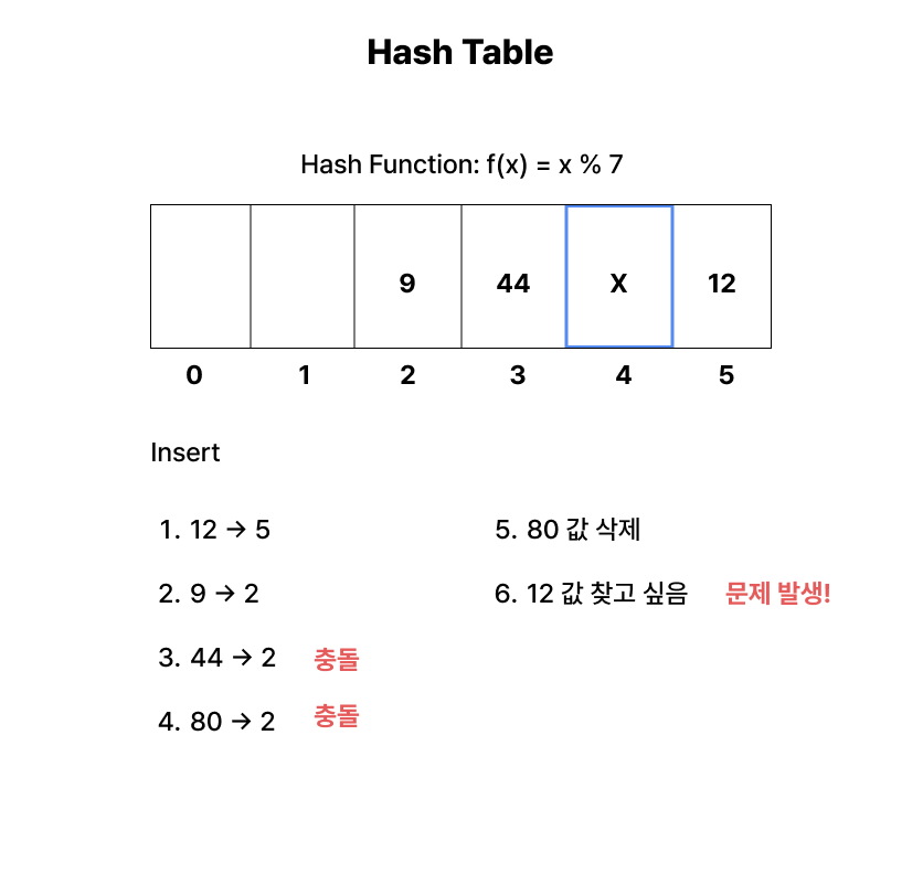 우리가 80값을 삭제하면, index 4 의 Bucket 이 비게 된다.
