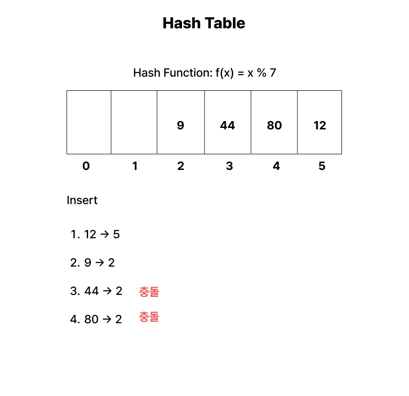 Hash Table 을 하나 만들고, 내부의 Hash 함수는 input 값을 7로 나눈 나머지 값을 반환한다.