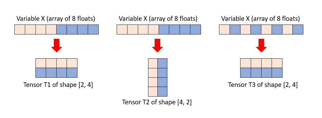 ML 프로그램이 변수를 조작할 때 변수를 다차원 텐서로 보는 것이 유용한 경우가 많습니다. 이 경우, 프로그램의 다른 부분에서는 기본 변수를 다른 종류의 텐서로 보기를 원할 수 있습니다(예: 행렬을 행 주요 또는 열 주요로 보기). 따라서 IPU의 프로그램에서 텐서는 기본 변수에 대한 뷰입니다.