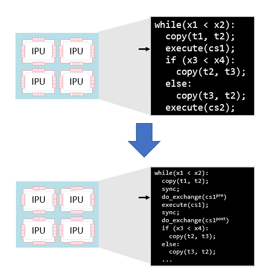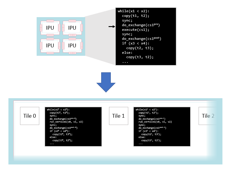 이는 프로그램이 기존 컴파일러를 통해 전달되어 타일 세트에서 실행될 수 없음을 의미합니다. 대신 프로그램은 먼저 IPU 칩 실행과 일치하는 형식으로 낮아집니다( 섹션 2.2 실행 에 설명된 대로 동기화, 교환 및 계산으로 구성됨 ).
