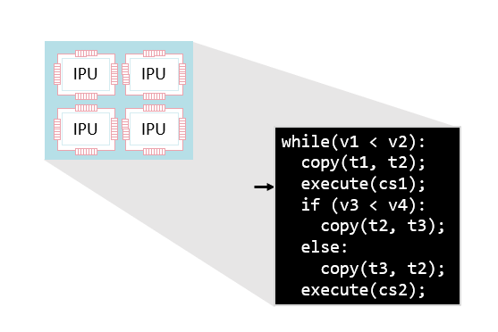 데이터 복사 및 컴퓨팅 세트 실행과 같은 기본 작업 외에도 IPU에서 실행되는 프로그램은 루프, 조건부 등과 같은 표준 제어 흐름을 실행할 수 있습니다. 예: