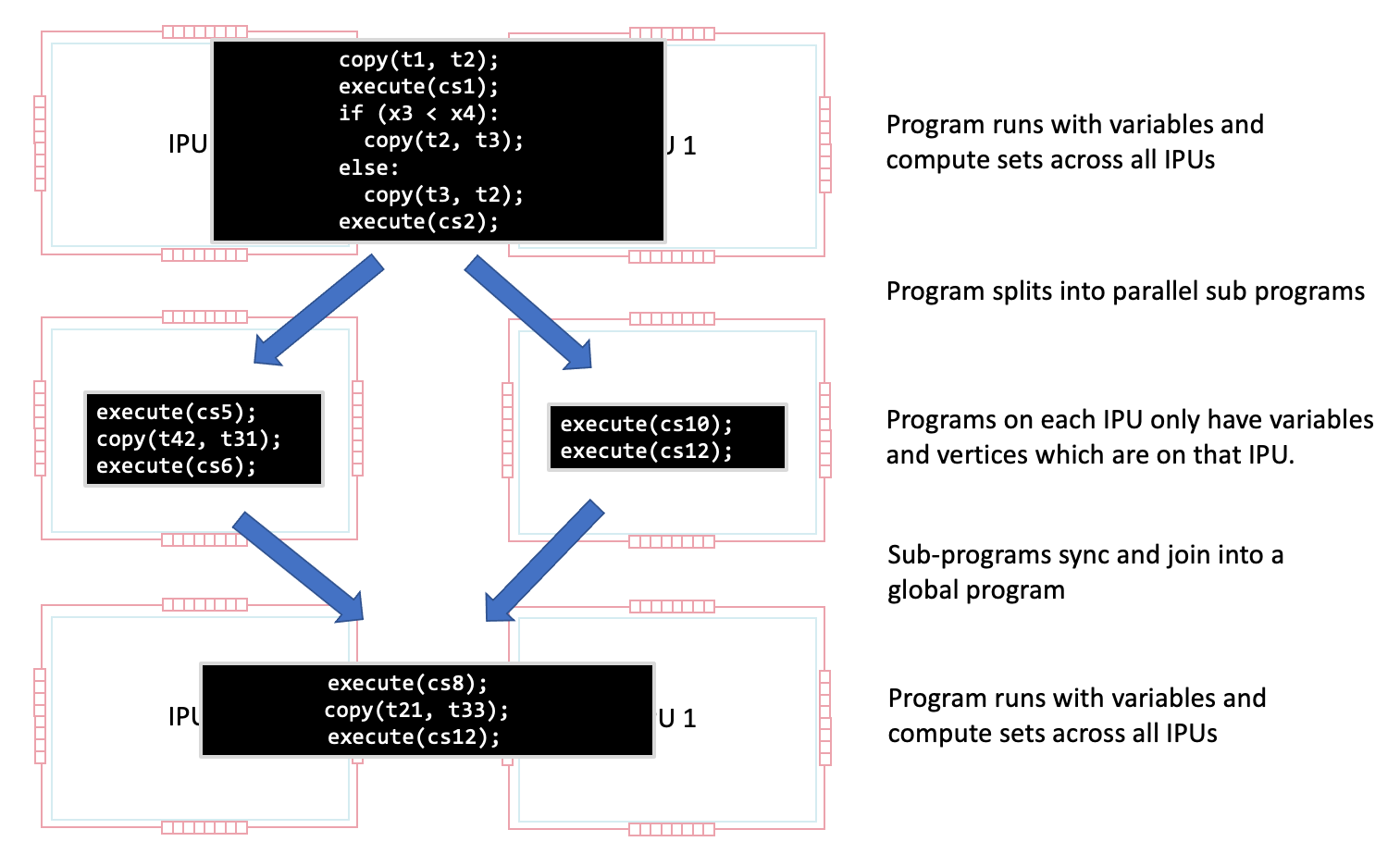 각 컴퓨팅 세트의 세분화된 병렬 처리뿐만 아니라 IPU 세트에서 실행되는 프로그램은 포크 조인 스타일 병렬 처리를 통해 병렬 하위 프로그램으로 분할될 수도 있습니다.