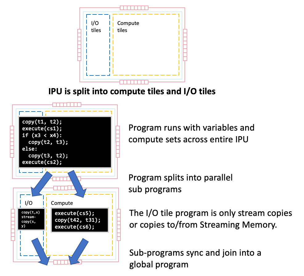 서로 다른 IPU에서 프로그램을 병렬로 실행하는 일반적인 방법 외에도 제한된 형태의 작업 병렬 처리가 IPU 내에서 실행될 수 있습니다. IPU는 두 세트의 타일 그룹으로 분할될 수 있습니다. 한 타일 그룹은 칩 외부에서 데이터를 가져오고 수신하는 I/O만 수행하고 다른 타일 그룹은 일반 컴퓨팅을 수행할 수 있습니다. 그런 다음 프로그램은 두 개의 하위 프로그램으로 분할되어 하위 프로그램 중 하나와 병렬로 실행되며 스트리밍 메모리에 있는 변수와 I/O 전용 타일 그룹에 대한 데이터 스트림 또는 복사본의 시퀀스를 실행합니다.