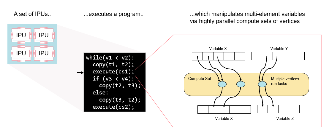 각 정점은 자체 입력 및 출력을 처리하는 작은 코드 조각(기본 프로그램과 별도로)을 실행합니다. 정점이 실행하는 코드 조각을 코드 렛 이라고 합니다 . 이 코드를 병렬로 실행하는 각 정점의 조합은 컴퓨팅 세트의 기능을 정의합니다. 정점 프로그래밍에 대한 자세한 내용은 Poplar 및 PopLibs 사용자 가이드 에서 확인할 수 있습니다 .