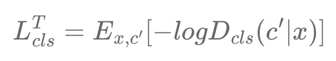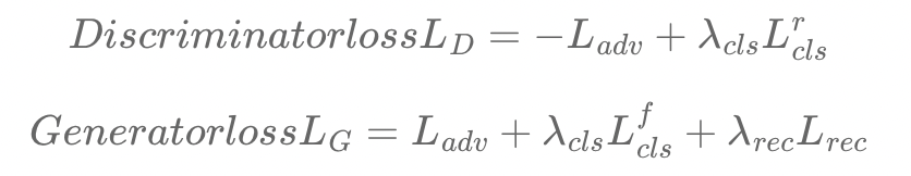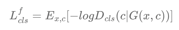 - 이전과 같이 real image와 fake image를 구별하고, 실제 이미지의 domain label이 나오도록 분류모델을 학습한다.