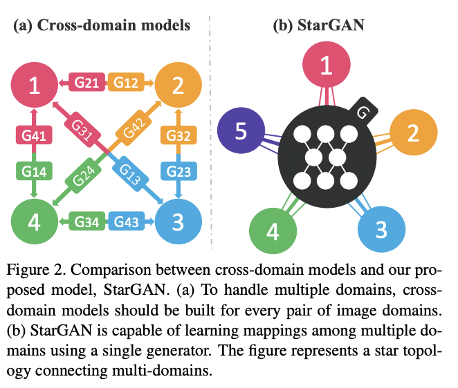 - 모든 가능한 도메인들사이의 매핑을 하나의 generator를 통해 학습함
