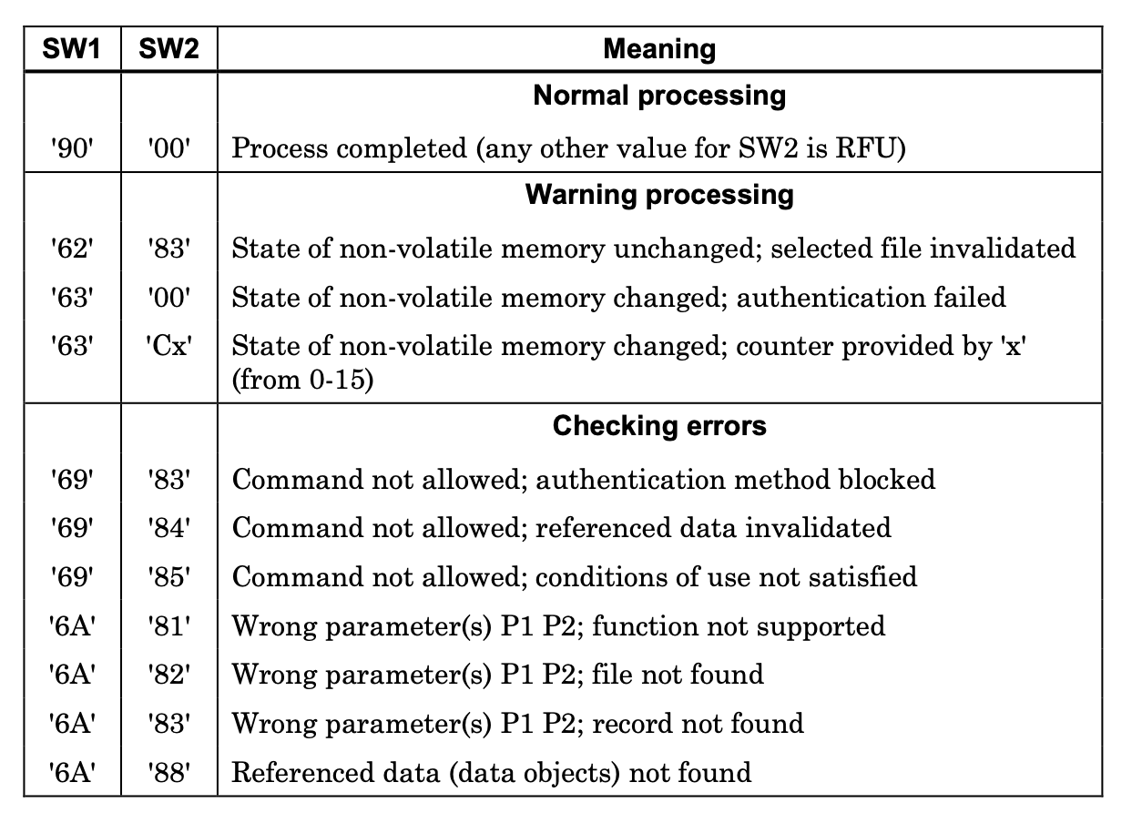 SW1 : '6x' 또는 '90': 정상, 경고, 또는 오류 상태를 나타내며 ISO/IEC 7816-4에 따라 된다.