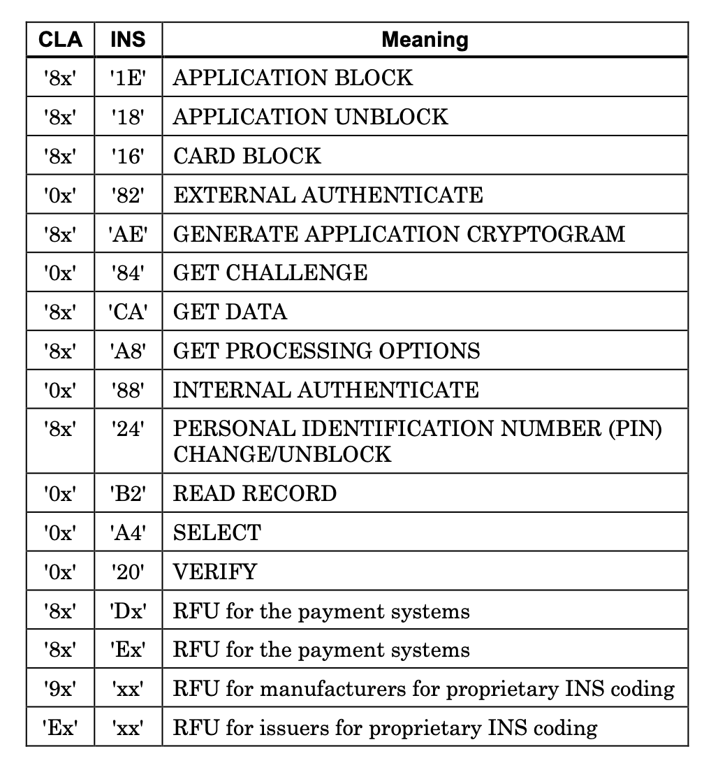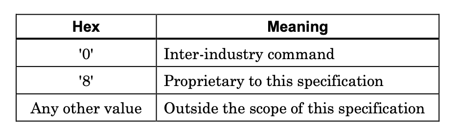 | 0 | 0 | 0 | 0 | - | - | - | - | '0X' | ISO/IEC 7816-4 첫 번째 산업 간 표준값. |
