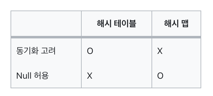 - Null Key 및 Null Value: 해시 맵은 하나의 Null Key와 여러 개의 Null Value를 허용한다. 반면, 해시 테이블은 Null Key 또는 Null Value를 허용하지 않는다.