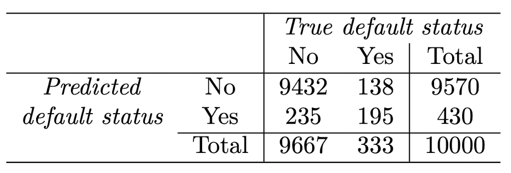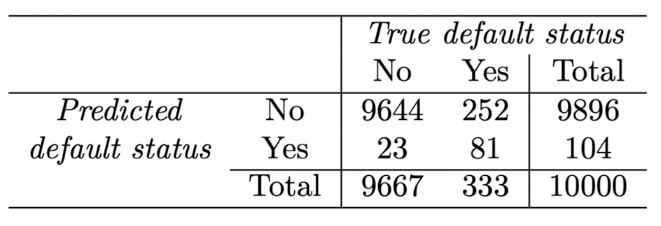 위 그림과 같은 표를 Confusion Matrix(혼동 행렬)이라고 한다. 이 표는 LDA를 이용해 카드값 연체 여부를 예측한 결과인데, LDA training error rate을 계산해보면 (23+252)/10000=0.0275로 2.57%이다.