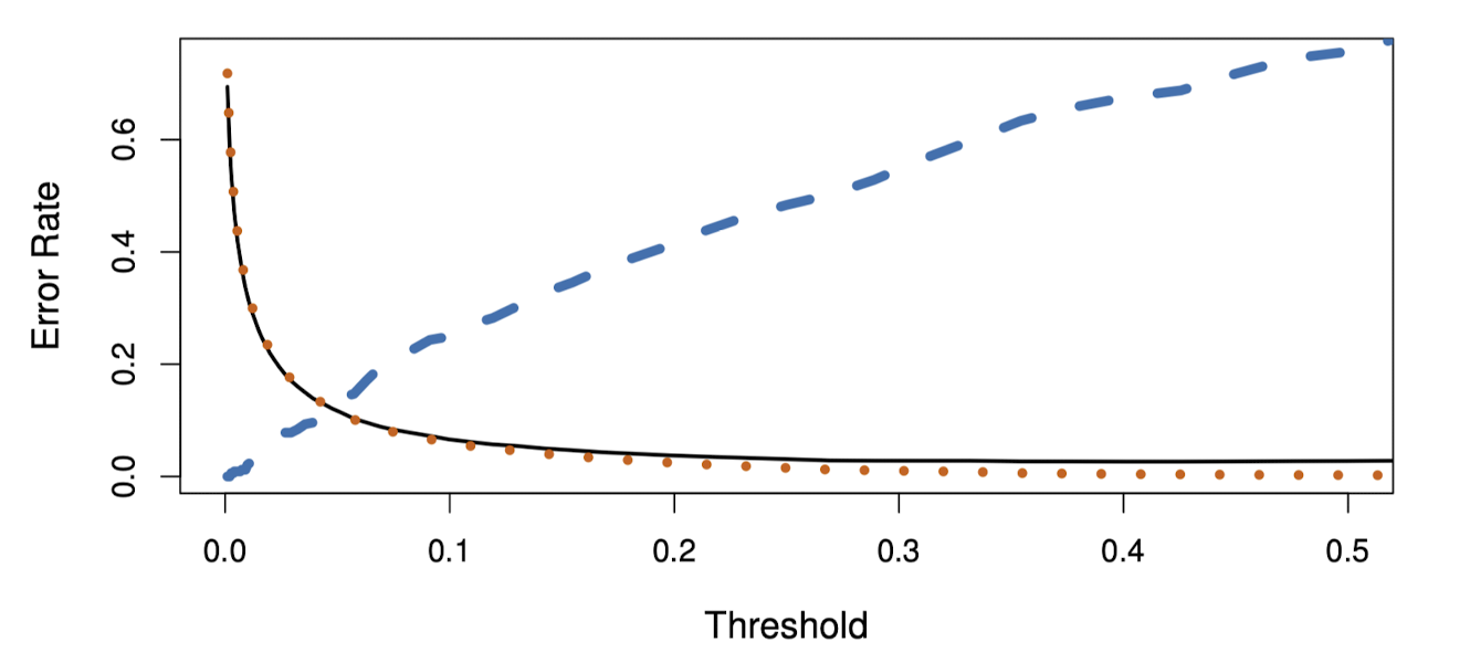 위 그림에서 파란색 점선은 (1-Sensitivity)로 연체자들 중 오분류된 비율, 주황색 점선은 (1-Specificity)로 비연체자들 중 오분류된 비율이다.