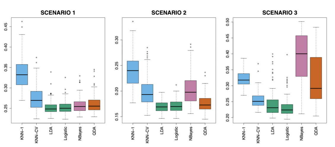 각 시나리오에서 100개의 랜덤 훈련 데이터 셋을 생성했고 각 분류 방법의 Test Error rate를 계산하여 박스플롯으로 나타냈다.
