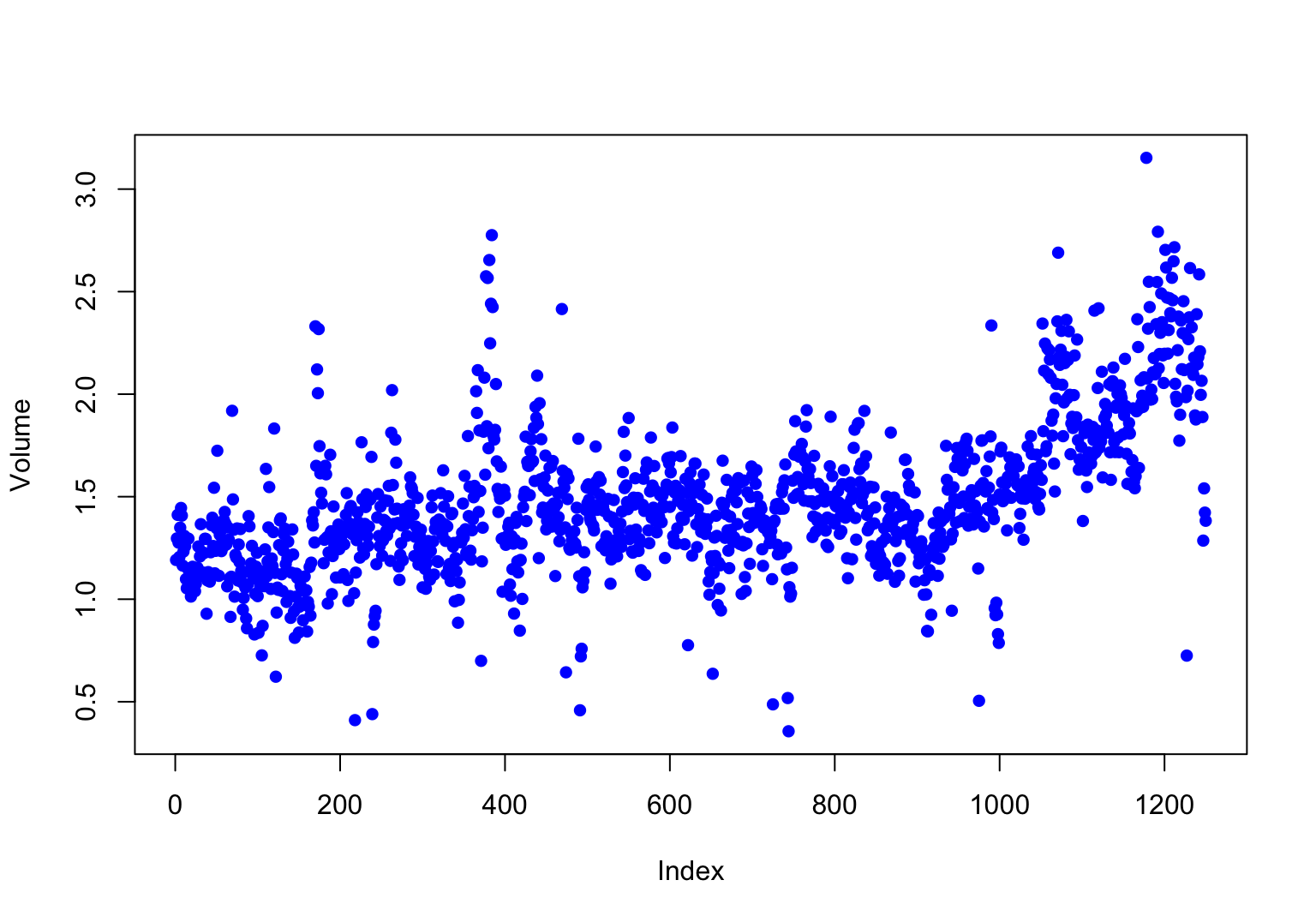 > plot(Volume, col = 'blue', pch = 16)