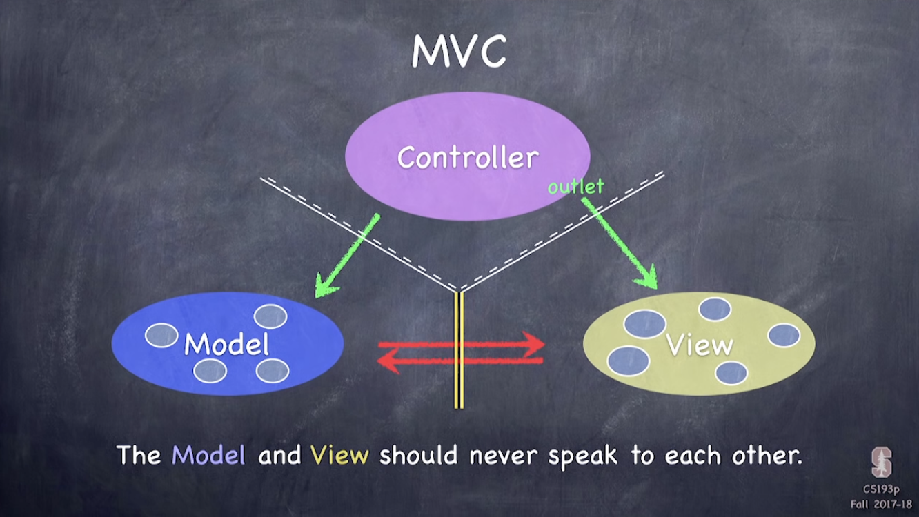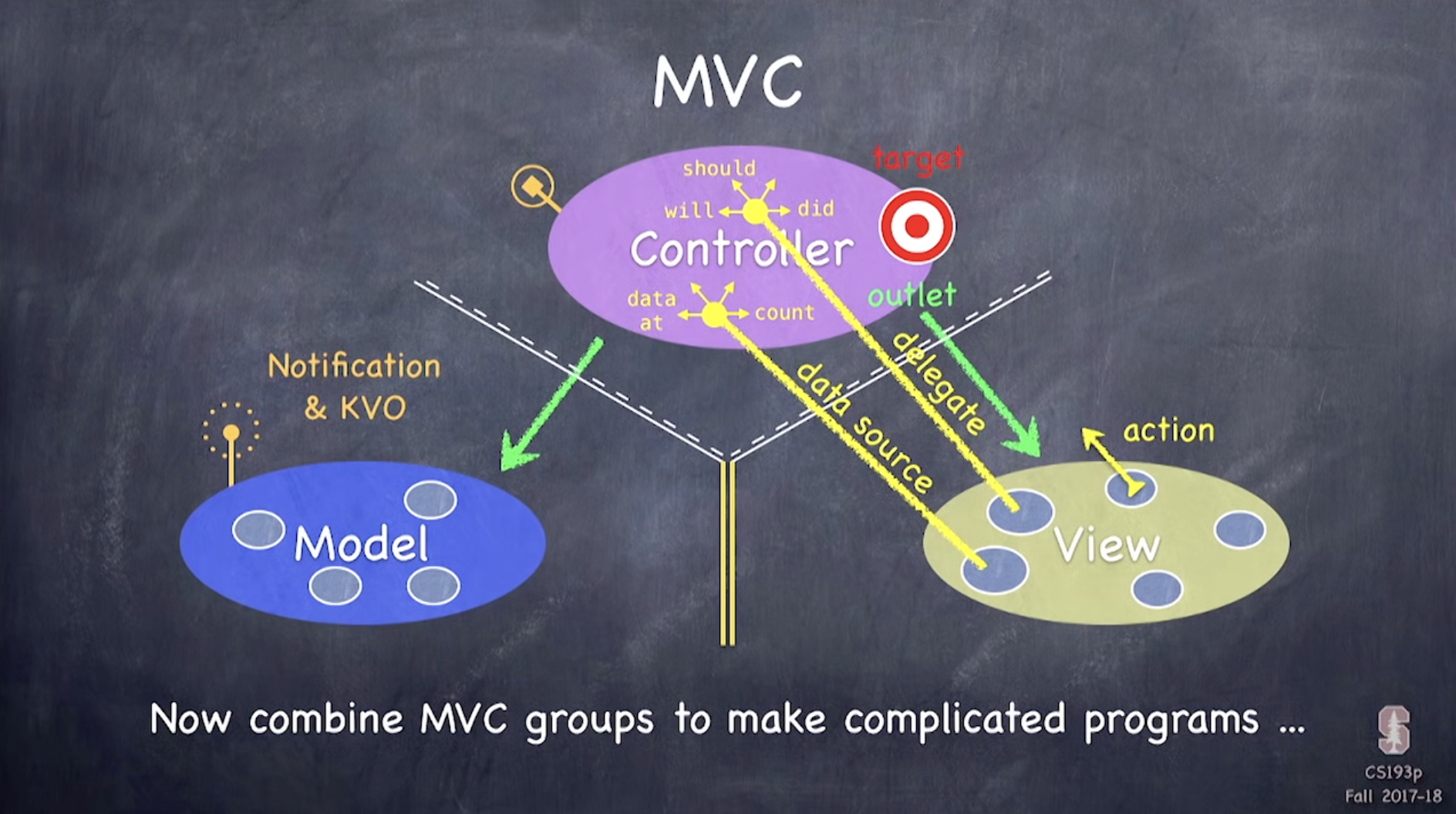 sometimes the View needs to synchronize with the Controller(e.g ScrollView(view item) may ask controller can I scroll horizontal? verticle?). complicated communications are done with predfinded methods (that the scrollView) defines as part of its delegate. a delegate is just a var in ScrollView that, and this var will have some object in it, and all we know about this object is that it responds to a certain number of messages. Most of these messages start with the words nil, should, or did. and the Controller, using a mechanism called protocols, is able to tell the scroll View, I'm ur delegate, and all the scroll View will know is that it implements will, should, and did. It doesn't know anything about it, such as it class,