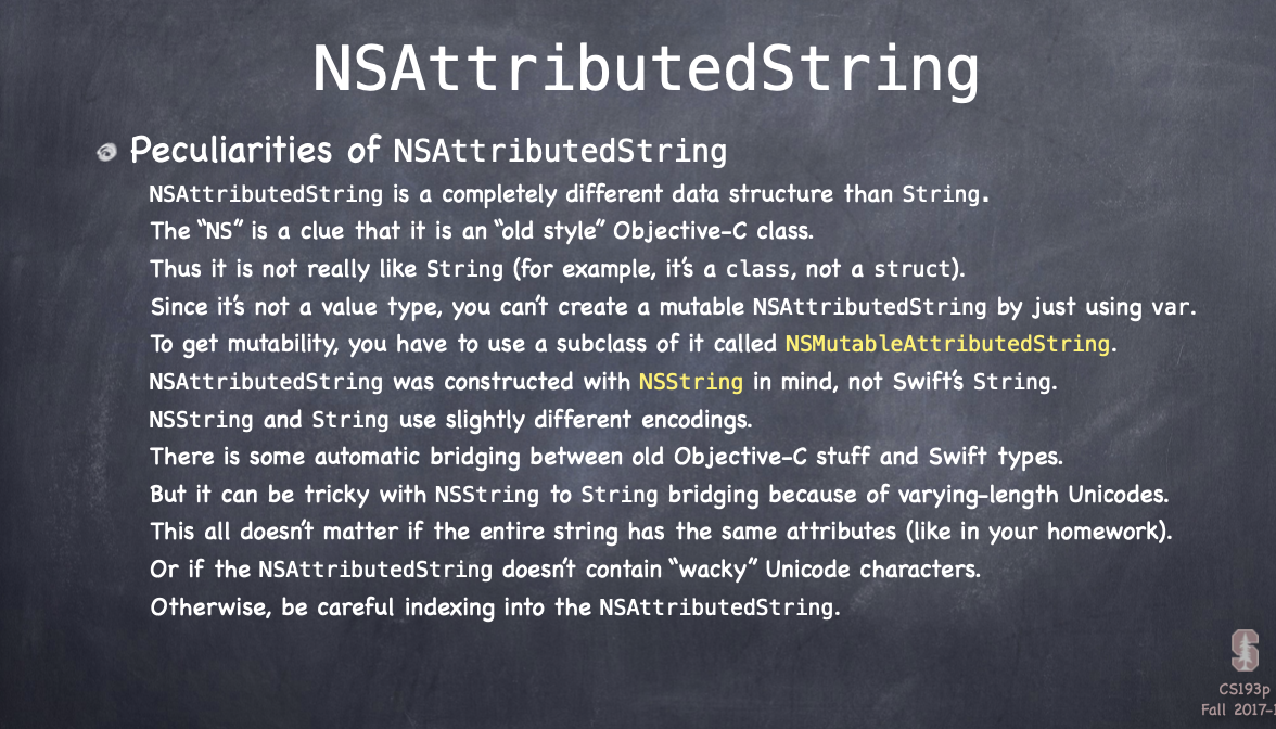 모든 character 가 자신을 스크린에 어떻게 나타낼 지(e.g. 폰트, 색깔 등)에 관한 딕셔너리를 갖고 있는 String 으로 UILable, UIButton 등에 사용할 수 있다. 참고로 read-only