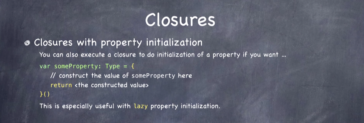 다음과 같은 방식으로 프로퍼티 초기화에도 사용할 수 있는데, lazy 키워드와 함께 사용하면 해당 프로퍼티가 호출되기 전까지 클로저가 실행되지 않으므로 매우 유용한다