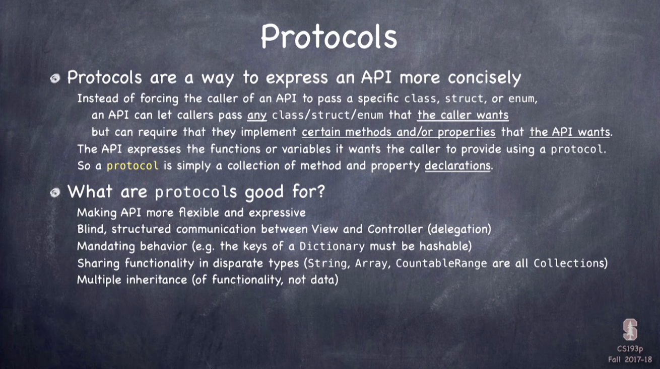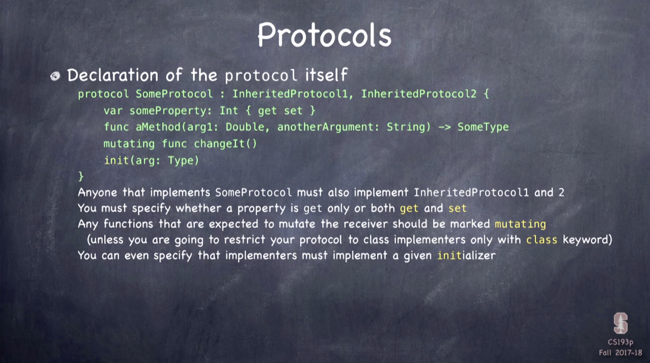 objective-c 의 프로토콜들의 경우 일부 프로퍼티/메서드만 구현해도 순응하는 것으로 인정하나, Swift 에서는 반드시 특정 프로토콜에 따르려면 해당 프로토콜의 모든 프로퍼티/메서드를 구현해야 함