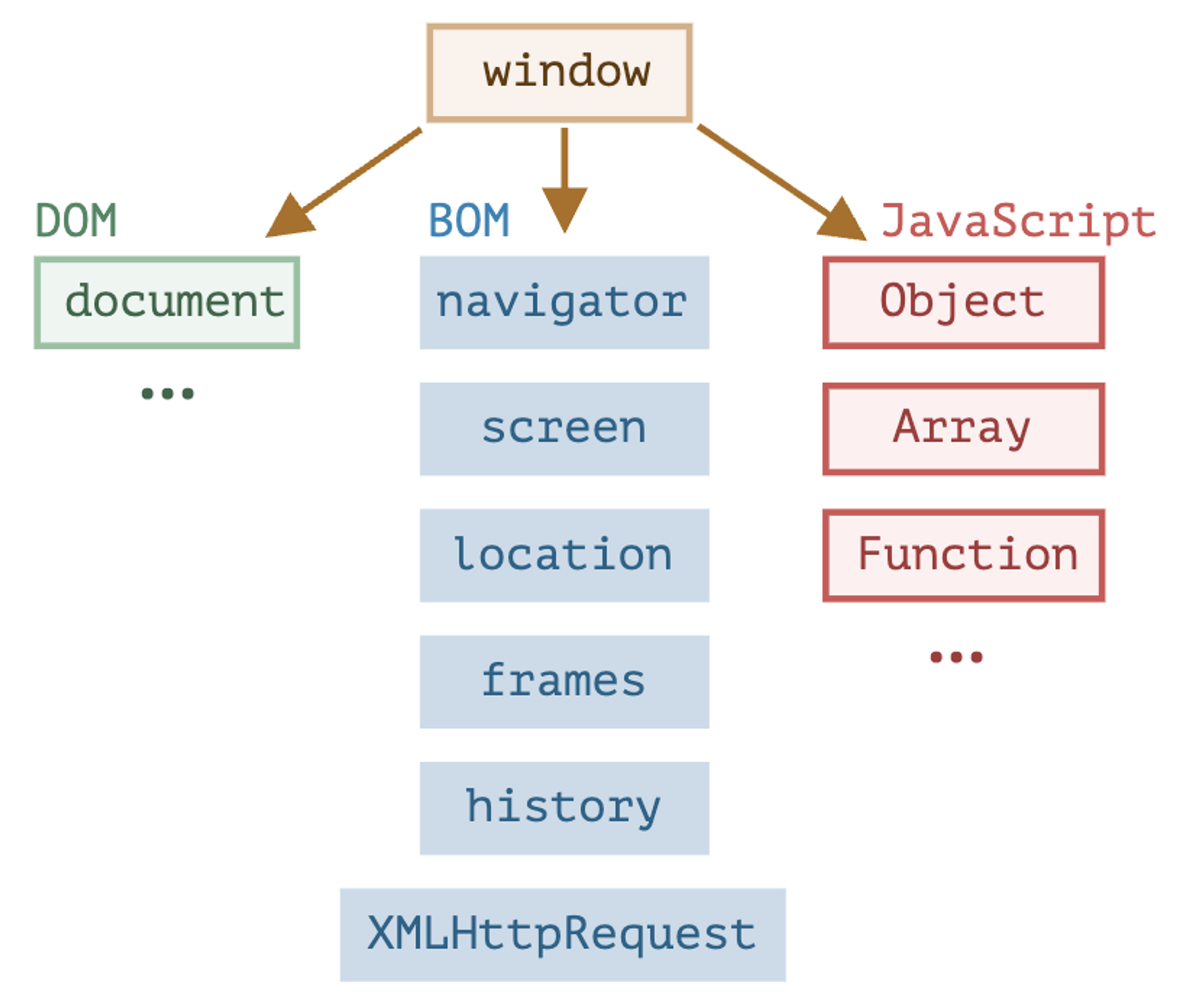 아래 그림과 같이, JavaScript 랭귀지 코어를 기반으로 플랫폼에서 객체와 함수를 추가로 제공한다.
