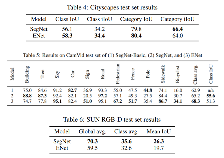 본 논문에서는 빠른 처리 속도와 높은 정확도로 최적화된 신경망을 제안하였다. Post processing을 수행하지 않았고, Compact한 Encoder-Decoder 구조의 빠른 처리속도를 보이고 있다. 제안된 방법은 Cityscapes, CamVid, SUN 데이터 셋에서 평가되었으며 NVIDIA Jetson TX1과 NVIDIA Titan X GPU 환경에서 실험하였다.