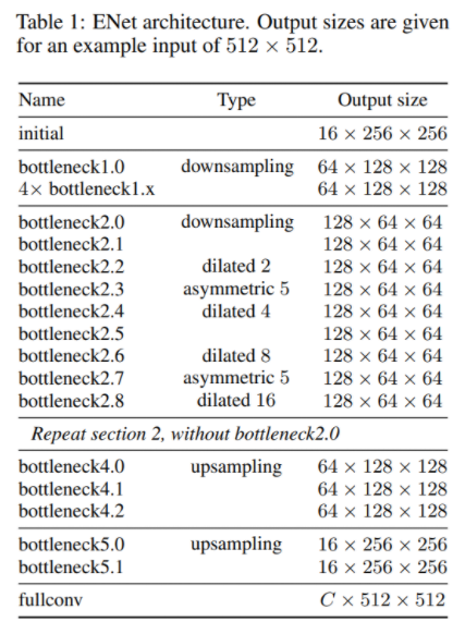 네트워크의 구조는 Table 1과 같다. 결과 크기는 512x512이며, 본 논문에서 사용하는 initial block과 bottleneck block은 다음과 같다.