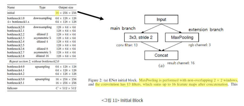 Initial block : 2개의 branch로 구성되어있는데 main branch는 3x3 conv을 수행하고 extension branch는 non-overlapping한 max pooling을 수행함