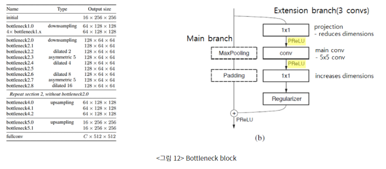 Bottleneck : Bottlenet block은 ENET architecture의 main block으로, down-sampling의 정보를 더 효율적으로 처리하기 위한 skip connection 형태를 가진 2 branch로 구성되어 있음, 각 블록은 3개의 컨볼루션 계층을 가짐