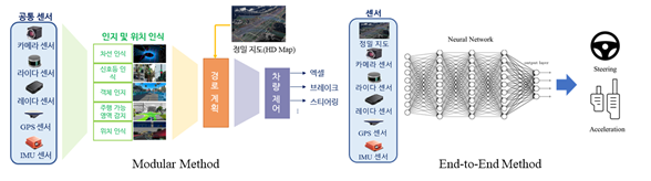 자율주행 자동차의 주행 방식에는 모듈러(Modular) 방식과 종단간(End-to-End) 주행 방식이 있으며, 현재 대부분의 연구 개발은 모듈러 방식으로 진행하고 있다.