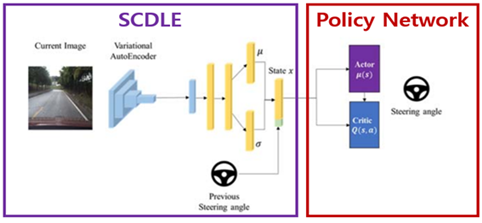 본 연구실에서는 입력된 도로 이미지를 의미 분할하고 변분 오토인코더를 통해 이미지를 압축하여 이를 강화 학습의 상태 변수로 사용해 조향각을 추론 및 평가하는 세계 최초의 심층 신경망을 구성하는 것을 연구하고 있다.