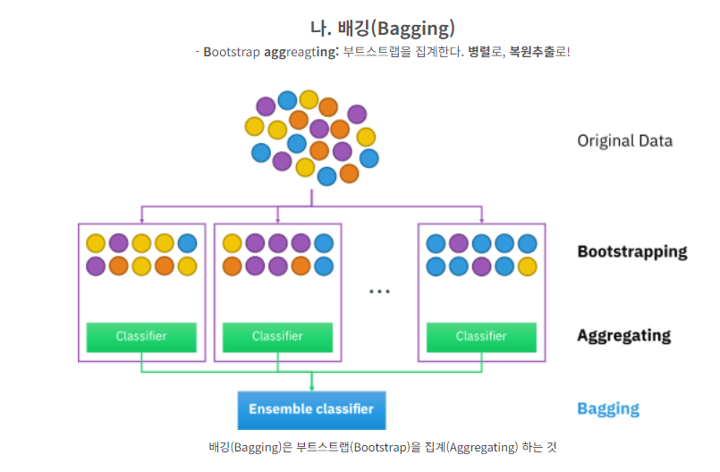 2) 배깅(Bagging): Bootstrap Aggregating의 약자로, 보팅(Voting)과는 달리 동일한 알고리즘으로 여러 분류기를 만들어 보팅으로 최종 결정하는 알고리즘