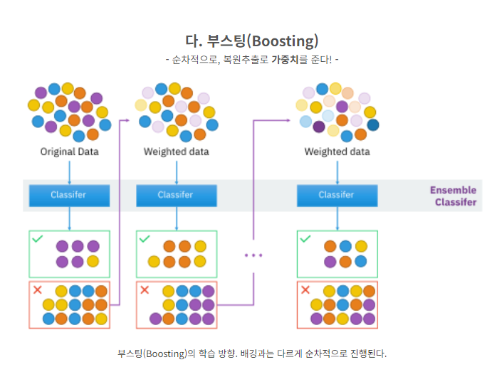 3) 부스팅(Boosting) : Bagging의 경우 각각의 분류기들이 학습시 상호영향을 주지 않은 상황에서(독립적) 학습이 끝난 다음 결과를 종합하는 기법이라면, Boosting은 여러개의 분류기가 순차적으로 학습을 수행