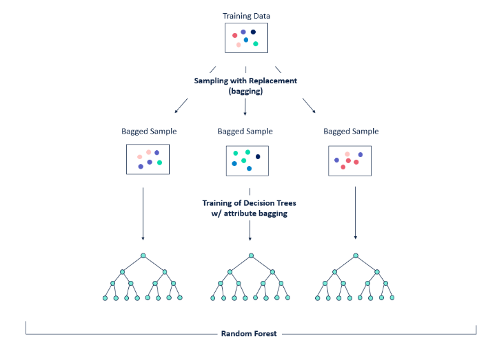 : 동일한 데이터로부터 복원추출을 통해 30개 이상의 데이터 셋을 만들어 각각에 의사결정나무를 적용한 뒤 학습 결과를 취합하는 방식