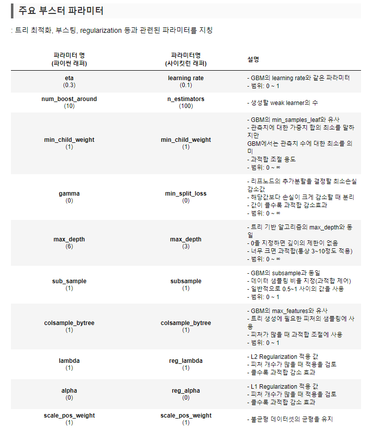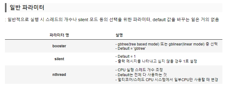 # - booster(기본값 gbtree): 부스팅 알고리즘 (또는 dart, gblinear)