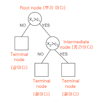 => 위 그림처럼 terminal node가 3개라면 전체 데이터가 3개의 부분집합으로 나눠짐- 의사결정나무는 분류(classification)와 회귀(regression) 모두 가능
