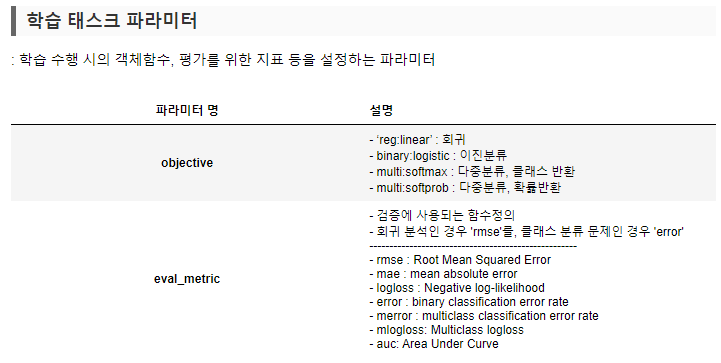 # - objective(기본값 binary:logistic): 이진분류 (다중분류: multi:softmax)