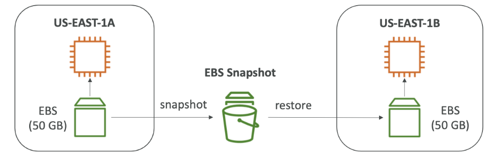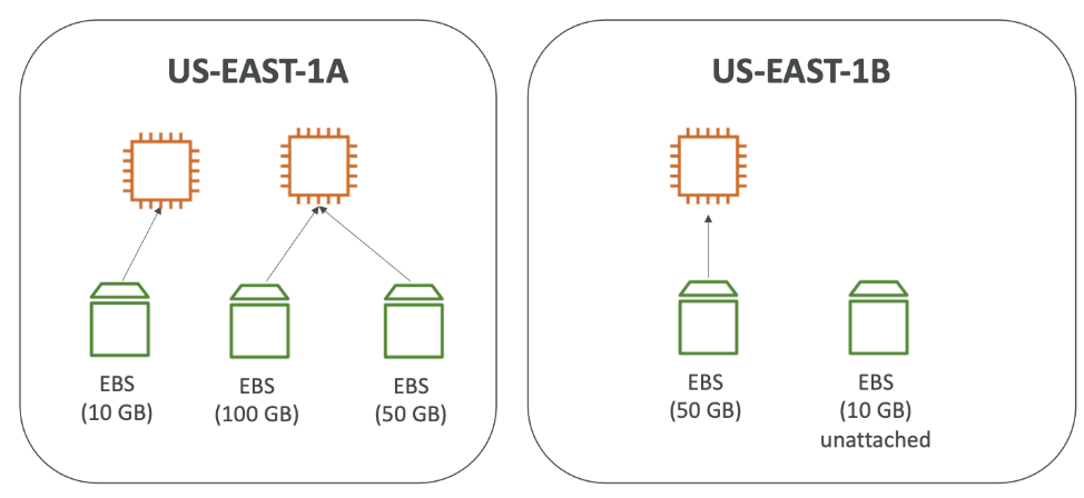 EBS 볼륨은 생성된 가용 영역(AZ) 내에서만 사용할 수 있습니다. 예를 들어, us-east-1a에서 생성된 볼륨은 us-east-1b에서 사용할 수 없습니다.