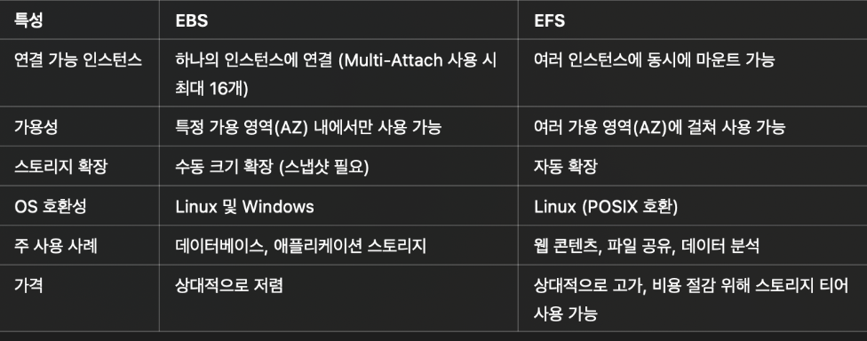 Amazon EFS는 확장성이 뛰어나고 여러 인스턴스에서 동시에 사용할 수 있는 네트워크 파일 시스템으로, 주로 파일 공유와 웹 콘텐츠에 적합하며, AWS 내 다양한 스토리지 옵션과 비교하여 각기 다른 요구 사항에 맞게 선택할 수 있습니다.