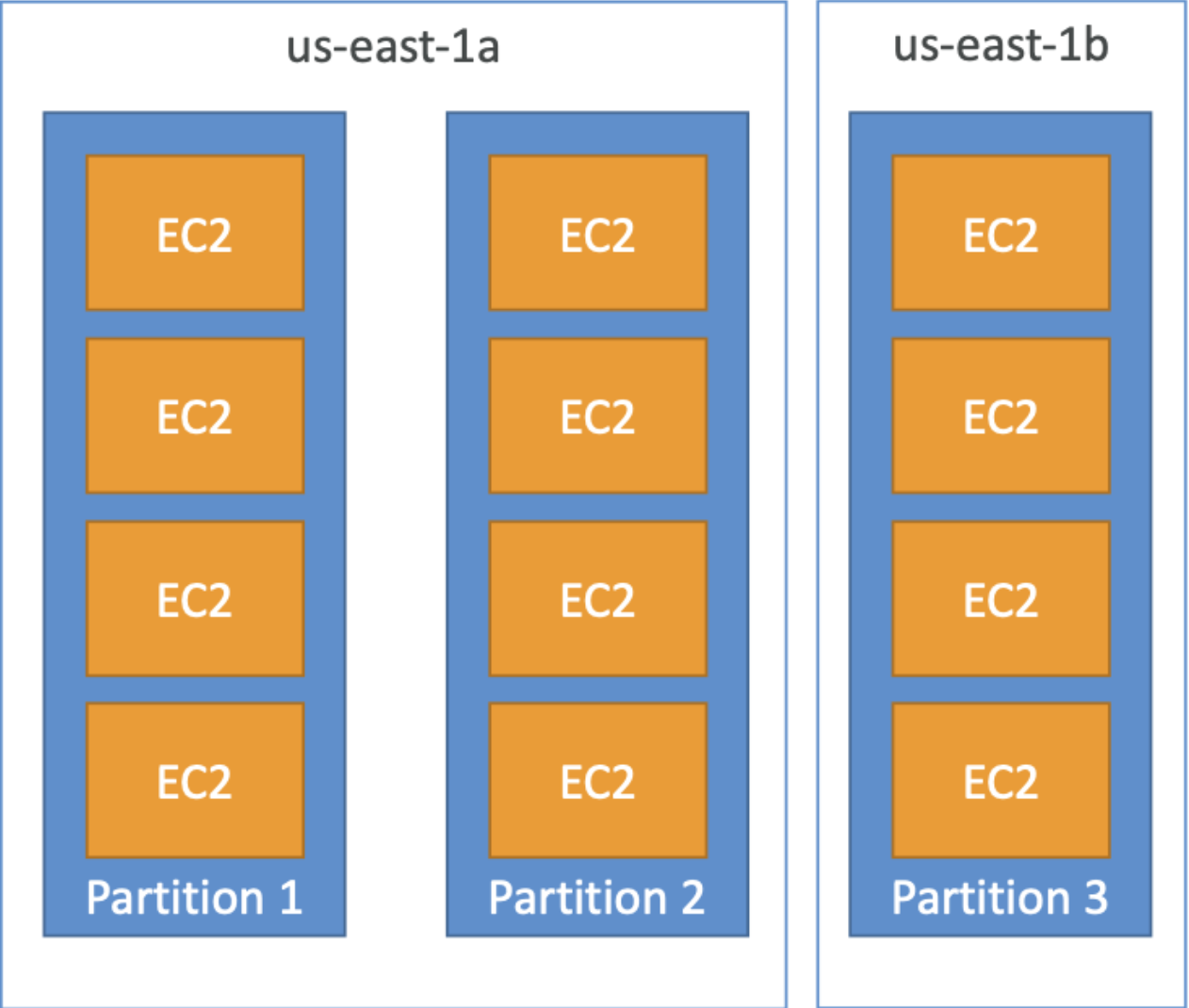 EC2 인스턴스를 여러 가용 영역에 걸쳐 여러 파티션에 분산하여 배치하는 전략입니다. 각 파티션은 독립된 물리적 하드웨어로 구성되어 있어, 특정 파티션에 장애가 발생하더라도 다른 파티션에 있는 인스턴스는 영향을 받지 않습니다.