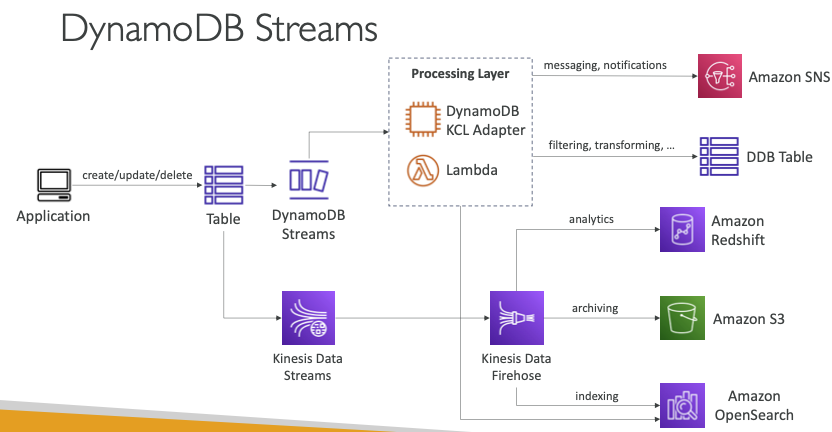 - DynamoDB Streams: 24시간 데이터 보관, 제한된 소비자 수